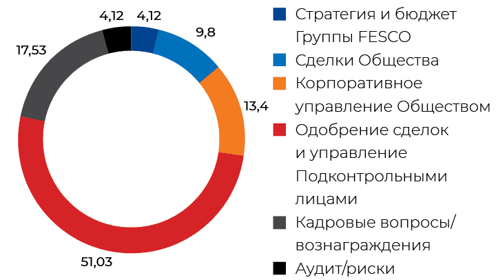 В отчетном году Советом директоров были рассмотрены вопросы в рамках работы над организационной структурой Компании, об избрании исполнительных органов Компании – Президента и Правления, о реализации непрофильных активов FESCO, а также иные вопросы, относящиеся к финансово-хозяйственной деятельности Компании, стратегическим и кадровым аспектам деятельности.